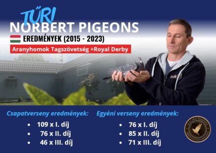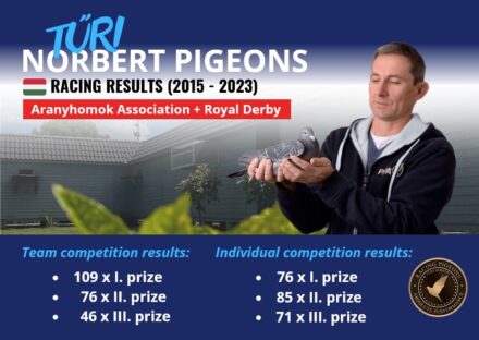 Tűri Norbert. Blood line from: Dolce Vita: 1. Dutch Olympiad bird allround '11 1. Int. acebird long dist. WENC '10 1. Nat. acebird WHZB '10 1. Nat. racing hen WHZB '10 1. Nat. acebird long dist. WHZB '10 1. NPO Chateauroux 1,418 p Tips: 1. NPO Ablis - 8,519 birds 1. Nat. Roscaberry – 5,054 birds 1. Nat. St. Malo – 1,053 birds 1. Peronne - 28,332 birds 1. Heteren - 27,931 birds 1. Chantilly - 21,892 birds Replay: 1. Nat.NPO Chantilly 30,074 p Pikeur 1. Prov Ablis 40,268 p Olympic Lucky 13: 1. Fulesd 1,615 pigeons 1. Aszod 1,465 pigeons