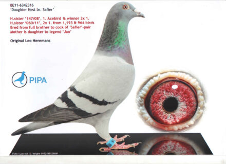 Norbert Tűri Father: Orig. Verbree. Son Chico * Sylvia. Chico: Directly to the breeding loft, one of the last sons from Olympic-Zigo super breeder. Grandfather of Mr. Performance. Mr. Performance: 1. 6090 p. 2017. Fastest 13976 p. 264,259 km 1st 3754 p. 264,259 km 1. 1914 p. 419,517 km 1. 672p. 355,407 km 2. 466 p. 367,188 km 4. 2851 p. 137,193 km Mother: Granddaughter Sister Esme. Esme: Olympiad bird allround Budapest 2015 1st Nat. acebird WHZB & TBOTB 2014