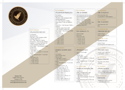 Tűri Norbert Blood line from: Little Star: 1. Nat. Acepigeon GMD yearlings KBDB 2015 Luc: 1. Nat. Argenton 12.446 p. Prima Dora: 1. Nat. Bourges 18.864 p. Gladiator: 2. Olympic bird Porto '05, 3. Nat. Acepigeon KBDB 2004 New Freddy: 1. Nat.Acepigeon KBDB Gr MD 2010. Olympic Nico: 1. Nat. BRNO '14 cat A 1. Nat. Olymp Budapest '15 cat A (20. World) 1. Nat. Olymp Brussels '17 cat D (28. World) Super Racer 261: 1. 4.379p. 319 km 1. 4.016p. 543 km 1. 2.345p. 261 km 1. 2.111p. 370 km 1. 1.934p. 169 km 1. 1.906p. 262 km 1. 1.491p. 342 km 1. 1.386p. 366 km