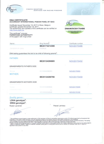 Tűri Norbert Father: Inbred New Laureaat Original Debusschere Roger. New Laureaat: Golden Wing Winner Super Barcelona Racer 2011-2013 Winner of: Barcelona 2013: 1. National 10,685 p 1. Int. Nat. 25,382 p Mother: Daughter New Remy Original Xiang Jixiang. New Remy: 1. nat. Barcelona 8764 pigeons 2014