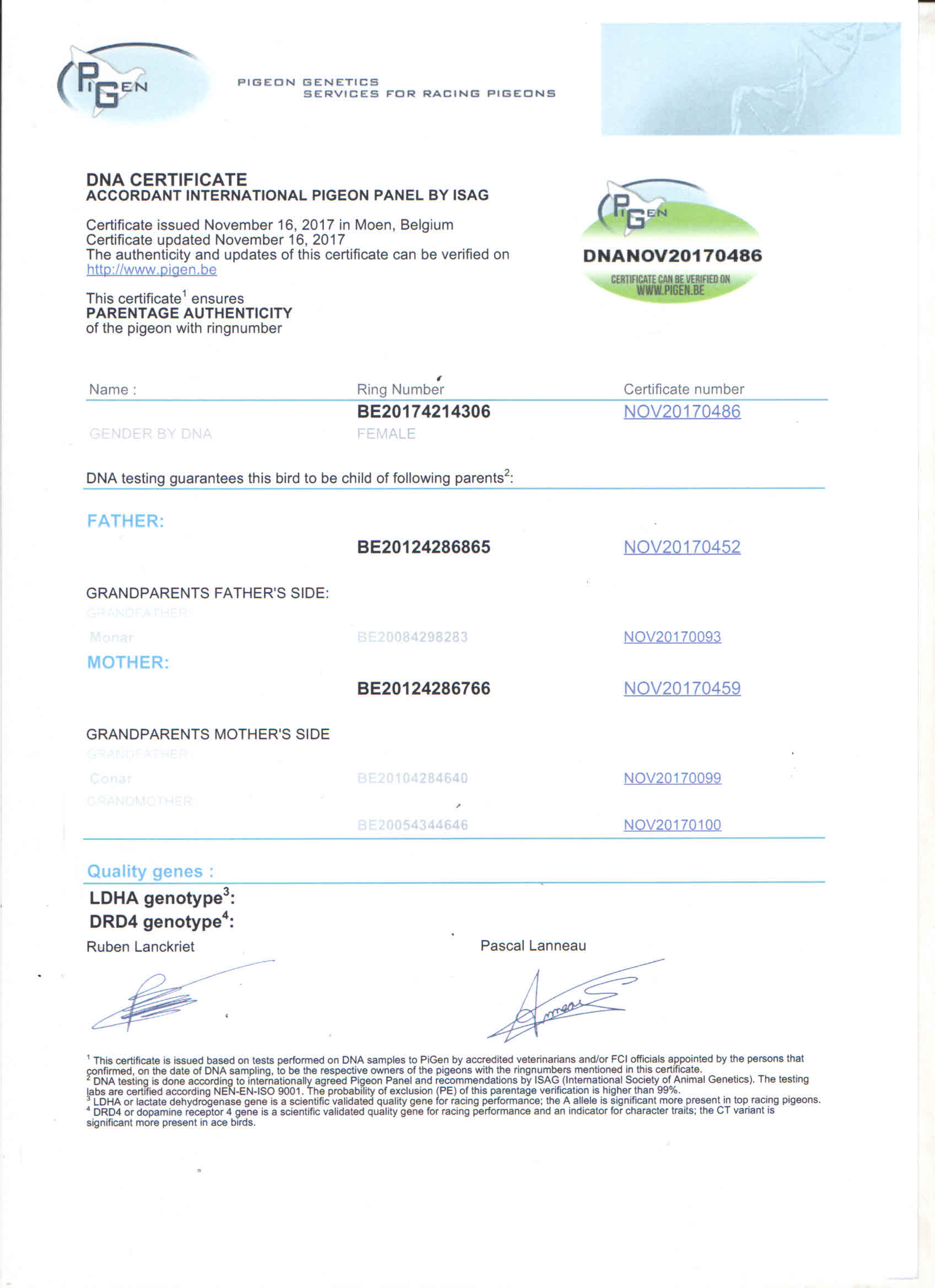 Tűri Norbert. Inbred New Remy Blood line from: New Remy: 1. Nat. Barcelona 8.764p. 2014 Inbred New Laureaat. New Laureaat: Golden Wing Winner Super Barcelona Racer 2011-2013 Winner of Barcelona 2013: 1. National 10,685 p 1. Int. Nat. 25,382 p Blue dusk: 1. Euro Diamond Award 1. Int. Nat. Ace p. all flights '16-'17 1. Int. Nat. Ace p. Perpignan '16-'17 1. Nat. top p. fund level 2 years zlu 2. Nat. Ace p. all flights '16 4. Nat.Ace p. all flights '17 5. Int. Nat. 14,930 p. Monar: 1. Int. Narbonne 12.605p. 1. Nat. Narbonne 6.428p.