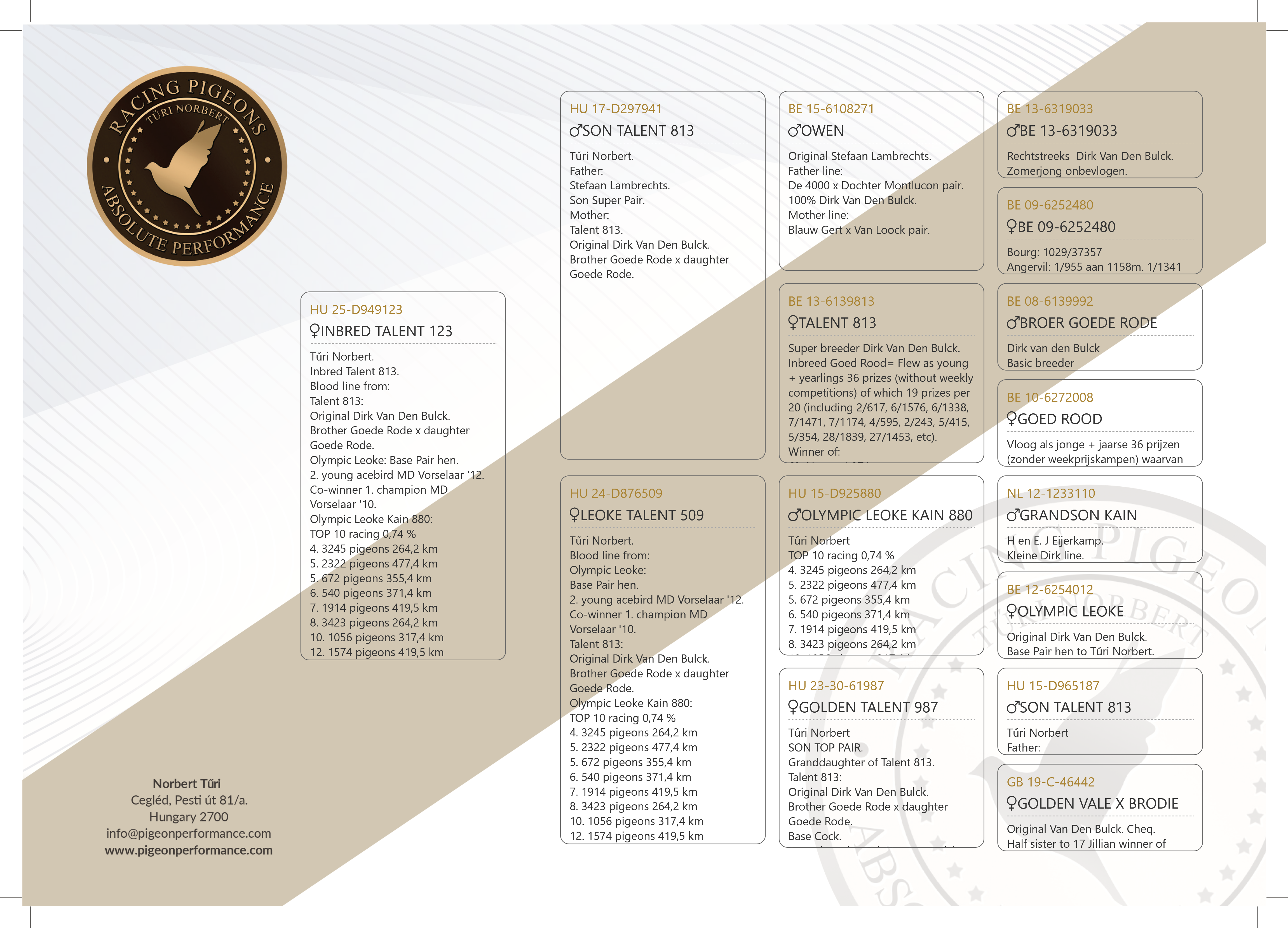 Tűri Norbert. Inbred Talent 813. Blood line from: Talent 813: Original Dirk Van Den Bulck. Brother Goede Rode x daughter Goede Rode. Olympic Leoke: Base Pair hen. 2. young acebird MD Vorselaar '12. Co-winner 1. champion MD Vorselaar '10. Olympic Leoke Kain 880: TOP 10 racing 0,74 % 4. 3245 pigeons 264,2 km 5. 2322 pigeons 477,4 km 5. 672 pigeons 355,4 km 6. 540 pigeons 371,4 km 7. 1914 pigeons 419,5 km 8. 3423 pigeons 264,2 km 10. 1056 pigeons 317,4 km 12. 1574 pigeons 419,5 km