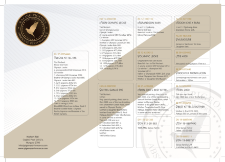 Tűri Norbert. Blood line from: Olympic Leoke: 2. young acebird MD Vorselaar 2012. Co-winner 1. champion MD Vorselaar 2012. Brother of Olympic Leoke Kain 880. Olympic Leoke Kain 880: 4. 3245 pigeons 264,2 km 5. 2322 pigeons 477,4 km 5. 672 pigeons 355,4 km 6. 540 pigeons 371,4 km 7. 1914 pigeons 419,5 km 8. 3423 pigeons 264,2 km 10. 1056 pigeons 317,4 km 12. 1574 pigeons 419,5 km TOP 10 racing 0,74 % Den 2000: Direct son to Base Cock II Brother Goede Rode x Olympic Rosita, topracer and breeder of the Kittel -dynasty.