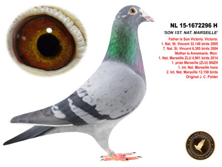 Norbert Tűri. Father: Original Yves Van De Poel. Blood line from: Red Ace: 1. Nat. Ace KBDB Extreme long distance 2016. Peggy: 1st Nat. Ace KBDB Extreme Long distance 2011. Poco Barcelona: 1st Nat. Barcelona Pipa Ace pigeon '19 5th Nat. Barcelona 7.301p. 2019 11th Int. Barcelona 16.051p. 2019 Miss Perpignan: 1st Nat. Perp. 4.191p. 2016 1st Nat. Perp. 2.915 hens 2016 3. Int. Perp. 12.698p. 2016 Mother blood line from: Annemarie: 1. Nat. Marseille ZLU 4,901 p '14 1st prize Marseille (ZLU) SNZH 1st Int. Nat. Marseille hens 2. Int. Nat. Marseille 12,158 p. Victoria: 1st Nat. St. Vincent 32,149 p '05 7th Nat. St. Vincent (S2) 6,385 p '04 New Remy: 1st Nat. Barcelona 8,764 p '14