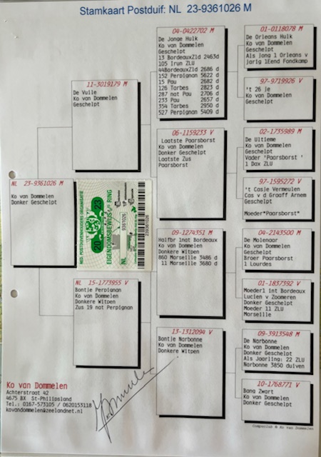 Tűri Norbert. Blood line from: Father is 100% Ko van Dommelen. Narbonne: 1. Nat./2. Int. Narbonne 14.457 b Monar: 1. Int. Narbonne 12605 1. Nat. Narbonne 6428 11. Nat. Narbonne 6330 13. Int. Narbonne 13335 52. Nat. Montauban 9091 2. Nat. Ace Pigeon 2011 Cat. E. L. D. Europe Cup Dortmund 2. Olympiade Pigeon Continental Cup Budapest 2012 E. L. D. Conar: 1. Nat. Cahors 8,348 p in 2012.