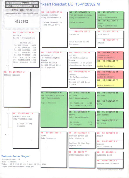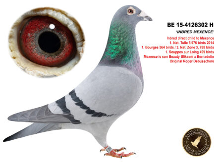 Tűri Norbert Strong inbred Mexence. Mexence: 1. Nat. Tulle 5,976 p 1. Reg. Bourges 564 p 1. Reg. Souppes 499 p 3. Z. Bourges 3,788 p Blood line from: Bliksem: 1. Provincial Poitiers 1,448 p 2. Provincial Chateauroux 4,662 p 4. Provincial Ruffec 1,778 p Witkopje: Fantastic 2x 1. massive winner 1. Quievrain 2,783 birds/ 2. prov. 10,538 birds, 1. Boxtel 2,510 birds/ 3. prov. 7,590 birds. Ohlala x Topstar. Ohlala: 2x 1. prov., 1. Bourges 1,966 p, 1. Brive 580 p. Topstar: 1. prize/66. Nat. Beziers 9,191 b '04, 1. prize/77. Nat. Montauban 7,303 b '05.