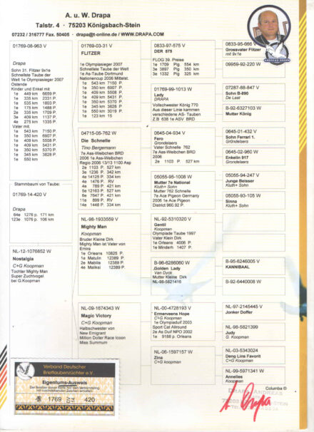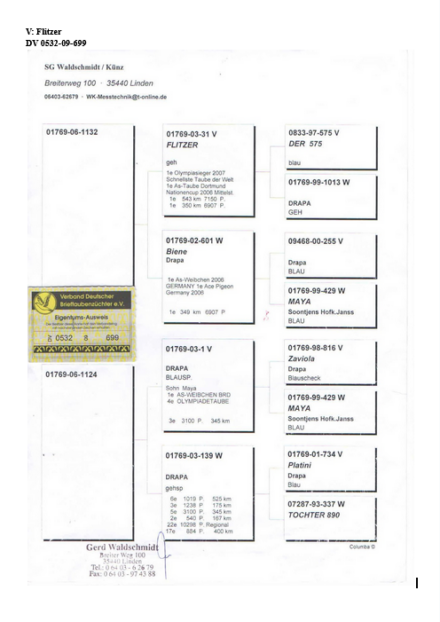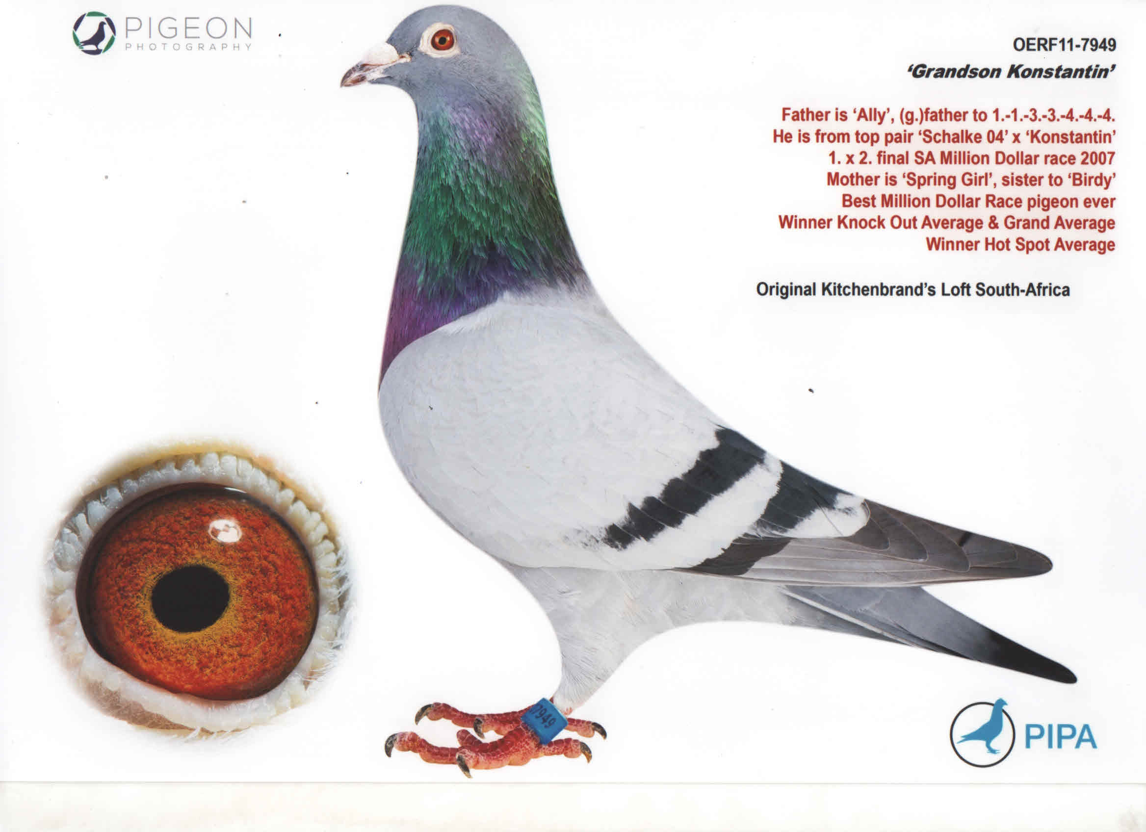 Tűri Norbert Father blood line from: Spring Girl', sister to 'Birdy' Best Million Dollar Race pigeon ever Winner Knock Out Average & Grand Average Winner Hot Spot Average 'Rubellos': 1. final SA Million Dollar race 2012. Mother: 100 % Andreas Drapa. Inbreed Flitzer. Flitzer: TOP ICON & BREEDER OF TOP Bred from 'Flitzer' Fastest bird in the world 1.Int. Olympiad winner MD Oostende 2007
