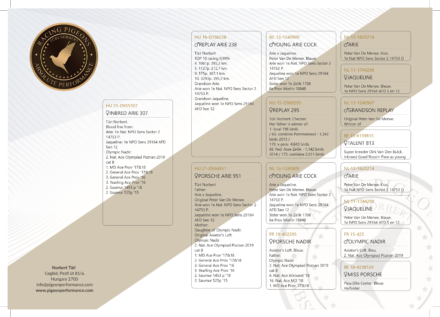 Tűri Norbert Father: Arie x Jaqueline. Original Peter Van De Merwe. Arie won 1e Nat. NPO Sens Sector 2 14753 P. Jaqueline won 1e NPO Sens 29164 AFD 5en 12 Mother: Daughter of Olympic Nadir. Original Aviator's Loft. Olympic Nadir: 2. Nat. Ace Olympiad Poznan 2019 cat B 1. MD Ace Prov '17&18 2. General Ace Prov '17&18 3. General Ace Prov '16 3. Yearling Ace Prov '16 2. Saumur 1453 p '18 2. Saumur 525p '15