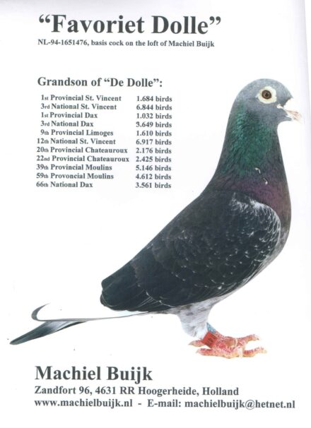 Tűri Norbert. Inbred Dolle. Blood line from: Dolle: 1. Prov. St. Vincent 1.684 p 980 km 3. Nat. St. Vincent 6.844 p 980 km 1. Prov. Dax 1.032 p 970 km 3. Nat. Dax 3.649 p 970 km 9. Prov. Limoges 1.610 p 650 km Narbonne: 1. Nat./2. Int. Narbonne 14.457 b Miss Cahors: 1e Nat. Cahors 10.381 p. Wittekop Sylvester: Worldclass Founder for Geerinckx Offspring Won: At Least 15x1.Prov 1. I.Prov 2.576 bp. 1. Noyon 502p. 1. Provincial 329p. 1. Toury 307 bp. 2. Nat. Lim 17.498p. 2. Nat. Argen 5.208p. 2. Provincial 1.800p. 2. Nat.Ace bird BV