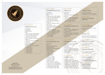 Tűri Norbert Blood line from: Dolle: 1. Prov. St. Vincent 1.684 p 980 km 3. Nat. St. Vincent 6.844 p 980 km 1. Prov. Dax 1.032 p 970 km 3. Nat. Dax 3.649 p 970 km 9. Prov. Limoges 1.610 p 650 km Narbonne: 1. Nat./2. Int. Narbonne 14.457 b Miss Cahors: 1e Nat. Cahors 10.381 p. Bonga: Superbreeder on the Loft of Joosen Jos. Offspring of Bonga won 1. Int. Nat. '10 Marseille 10.343 p 1. Int. Nat. '06 Perpignan 14.812 p 1. Nat. '12 Montelimar 6.717 p 2. Nat.Orange 4.587 p 1. Prov. Bordeaux 1. Prov. Orange