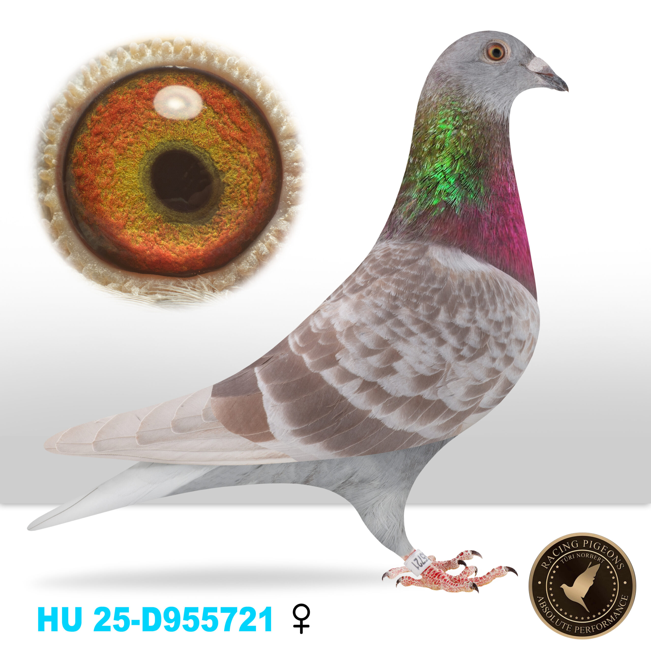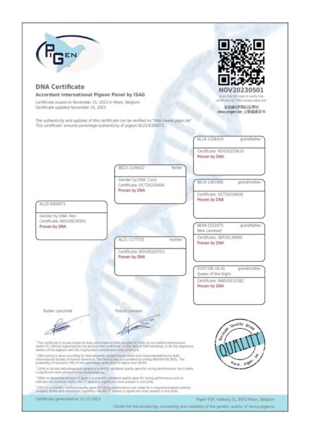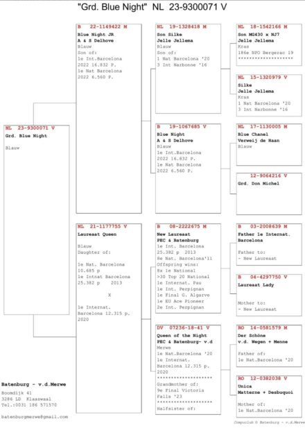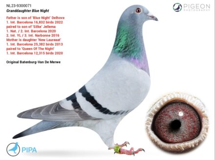 Tűri Norbert. Blood line from: New Laureaat: Golden Wing Winner Super Barcelona Racer 2011-2013 Winner of Barcelona 2013: 1. National 10.685 1. Internat. 25.382 Kleine Jade: 1.Int. Barcelona 21,169p Jef: 1. Int. Nat. Barcelona 16,051 p 2019 (speed 943 m/m) Distance 1083km wins with 1'30 lead 1.Ace Pigeon E.L.D. Sans Peur Herent Blue Night: 1. Int. Barcelona 2022 16.832p. 1. Nat. Barcelona 2022 6.560p. Silke: 1 Nat. Barcelona 2020 3. Int. Narbonne 2016 Queen Of The Night: 1. Nat. Barcelona 2020 1. Internat.