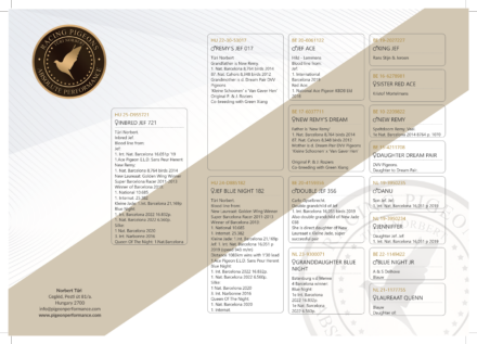 Tűri Norbert. Inbred Jef. Blood line from: Jef: 1. Int. Nat. Barcelona 16.051p '19 1.Ace Pigeon E.L.D. Sans Peur Herent New Remy: 1. Nat. Barcelona 8,764 birds 2014 New Laureaat: Golden Wing Winner Super Barcelona Racer 2011-2013 Winner of Barcelona 2013: 1. National 10.685 1. Internat. 25.382 Kleine Jade: 1.Int. Barcelona 21,169p Blue Night: 1. Int. Barcelona 2022 16.832p. 1. Nat. Barcelona 2022 6.560p. Silke: 1 Nat. Barcelona 2020 3. Int. Narbonne 2016 Queen Of The Night: 1.Nat.Barcelona '20 1. Internat.