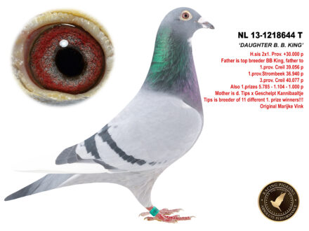 Tűri Norbert Father: Inbred Olympic Miss Gijsje. Jelle Jellema/Arjan Beens line. Olympic Miss Gijsje: 1. Cat E Olympiade Nitra Slowakije 2013 7. Nat. Cahors 11,054 duiven '10 6. NU Brive 18,246 duiven '10 7. NU Montpelier 10,253 duiven '11 Mother: Blood line from: New Laureaat: Barcelona 2013 1. National 10.685 p 1. Internat. 25.382 p Barcelona 2012 Kleine Jade: 1. Int. Nat. Barcelona '14 Special One: 1. Int. Barcelona 19,083 p '15 Harry won: 1st Blois 37728 b 1st Chateaur 22340 b 3rd Chateaud 21520