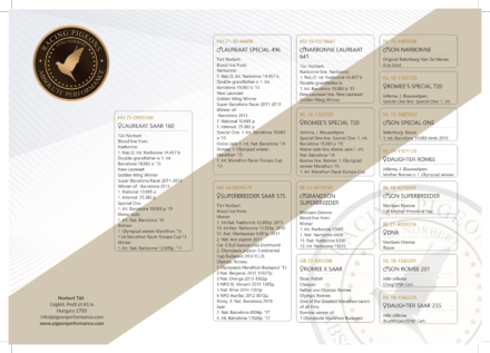 Tűri Norbert Blood line from: Narbonne: 1. Nat./2. Int. Narbonne 14.457 b Double-grandfather is 1. Int. Barcelona 19,083 b '15 New Laureaat: Golden Wing Winner Super Barcelona Racer 2011-2013 Winner of: -Barcelona 2013 1. National 10.685 p 1. Internat. 25.382 p Special One: 1. Int. Barcelona 19,083 p '15 Kleine Jade:1. Int. Nat. Barcelona '14 Romee: 1. Olympiad winner Marathon '15 1. Int. Marathon Racer Europa Cup '13