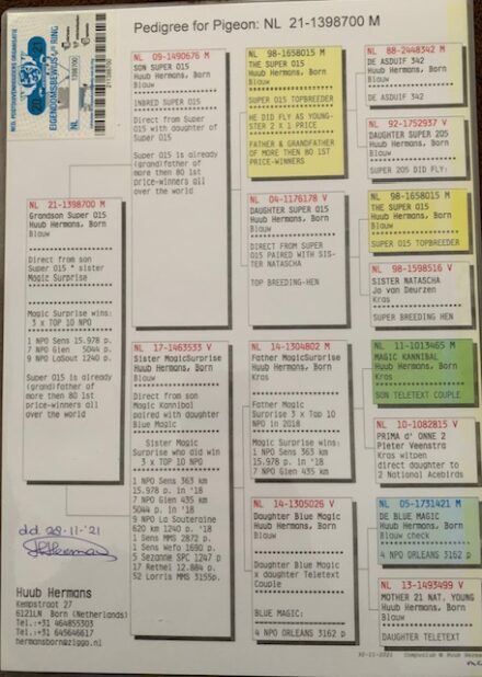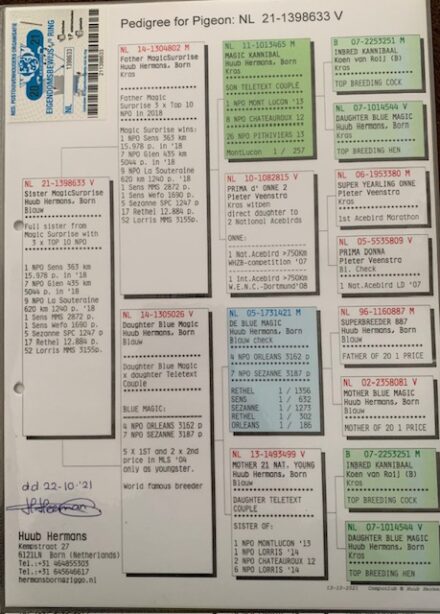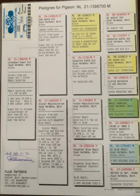 Tűri Norbert 100 % Huub Hermans. Blood line from: Magic Surprise: 3 x TOP 10 NPO 1 NPO Sens 363 km 15.978p. in 2018 7 NPO Gien 435 km 5044p. in 2018 9 NPO La Souteraine 620km 1240p. 2018 Super 015 is already (grand)father of more then 80 1st price-winners all over the world
