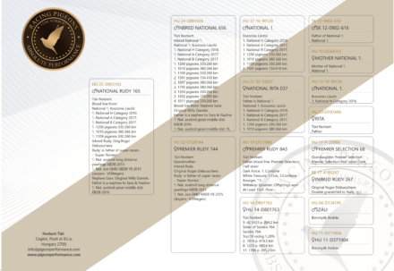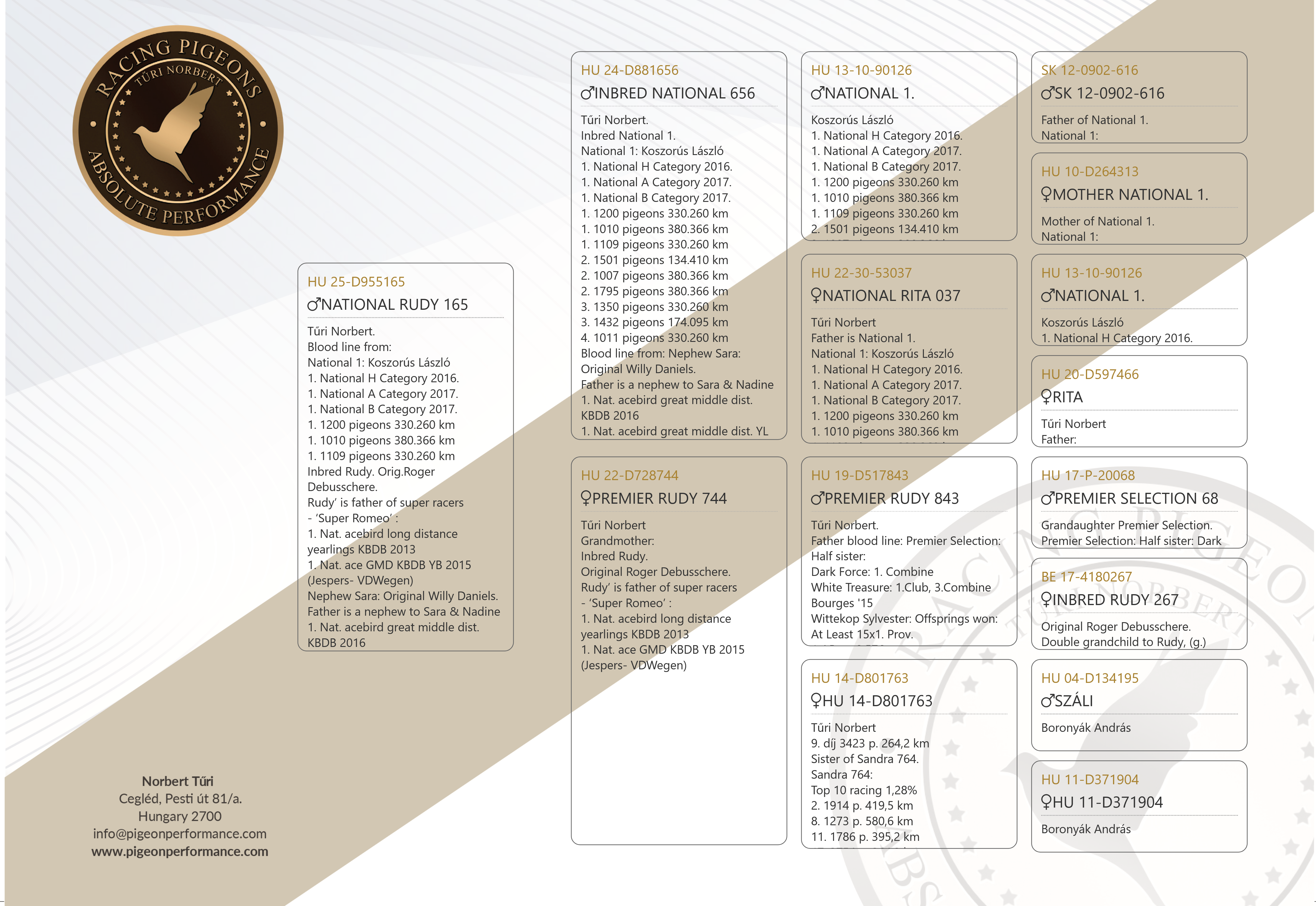 Tűri Norbert. Blood line from: National 1: Koszorús László 1. National H Category 2016. 1. National A Category 2017. 1. National B Category 2017. 1. 1200 pigeons 330.260 km 1. 1010 pigeons 380.366 km 1. 1109 pigeons 330.260 km Inbred Rudy. Orig.Roger Debusschere. Rudy’ is father of super racers - ‘Super Romeo’ : 1. Nat. acebird long distance yearlings KBDB 2013 1. Nat. ace GMD KBDB YB 2015 (Jespers- VDWegen) Nephew Sara: Original Willy Daniels. Father is a nephew to Sara & Nadine 1. Nat. acebird great middle dist. KBDB 2016 1. Nat. acebird great middle dist. YL KBDB 2017 Nadine was sold for 400,000 Euro as most expensive pigeon ever in the world.
