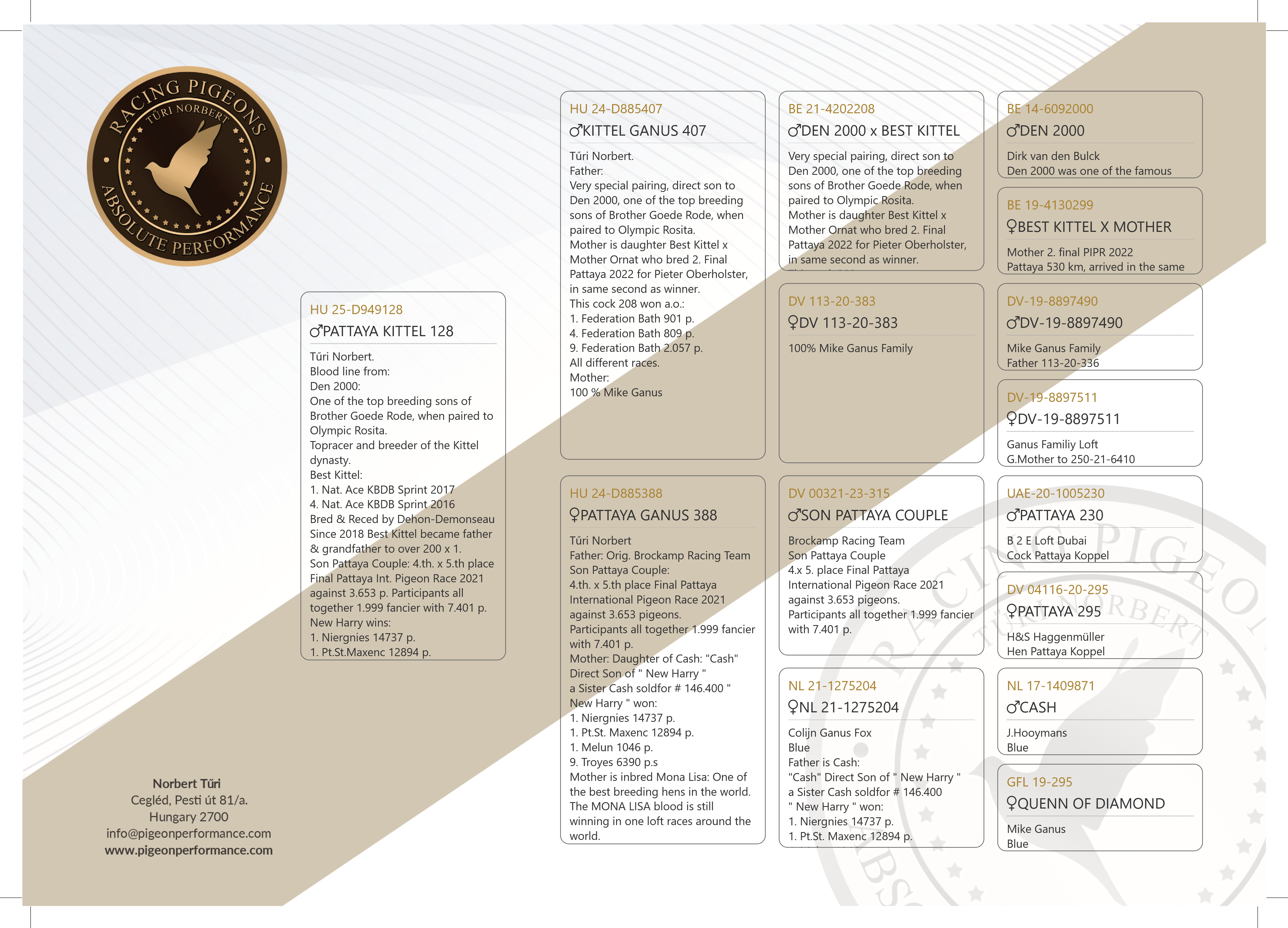Tűri Norbert. Blood line from: Den 2000: One of the top breeding sons of Brother Goede Rode, when paired to Olympic Rosita. Topracer and breeder of the Kittel dynasty. Best Kittel: 1. Nat. Ace KBDB Sprint 2017 4. Nat. Ace KBDB Sprint 2016 Bred & Reced by Dehon-Demonseau Since 2018 Best Kittel became father & grandfather to over 200 x 1. Son Pattaya Couple: 4.th. x 5.th place Final Pattaya Int. Pigeon Race 2021 against 3.653 p. Participants all together 1.999 fancier with 7.401 p. New Harry wins: 1. Niergnies 14737 p. 1. Pt.St.Maxenc 12894 p. 1. Melun 1046 p. 9. Troyes 6390 p. 38. Blois 6613 p.