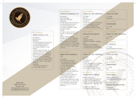Tűri Norbert. 100 % Jan Polder Father: Son Annemarie. Annemarie: 1st. Nat. Marseille ZLU 2014 4.901 p. 1st. prize Marseille (ZLU) SNZH 1st. Internat. Marseille hens 2nd. Internat. Marseille 12.158 p. Grandson Victoria. Victoria: 1st. Nat. St. Vincent 32.149 p. 2005 7th Nat. St. Vincent (S2) 6.385 p. 2004 Mother: Daughter Dieseltje. Dieseltje won herself 11 Marathon pizes. Including 4 times Barcelona. 1st Barcelona and 1st Perpignan in combine 2014 and 1st Ace Pigeon Marathon. Dame to 1st National Ace Pigeon 2017-2018=> Black Warrior (6 from 6)
