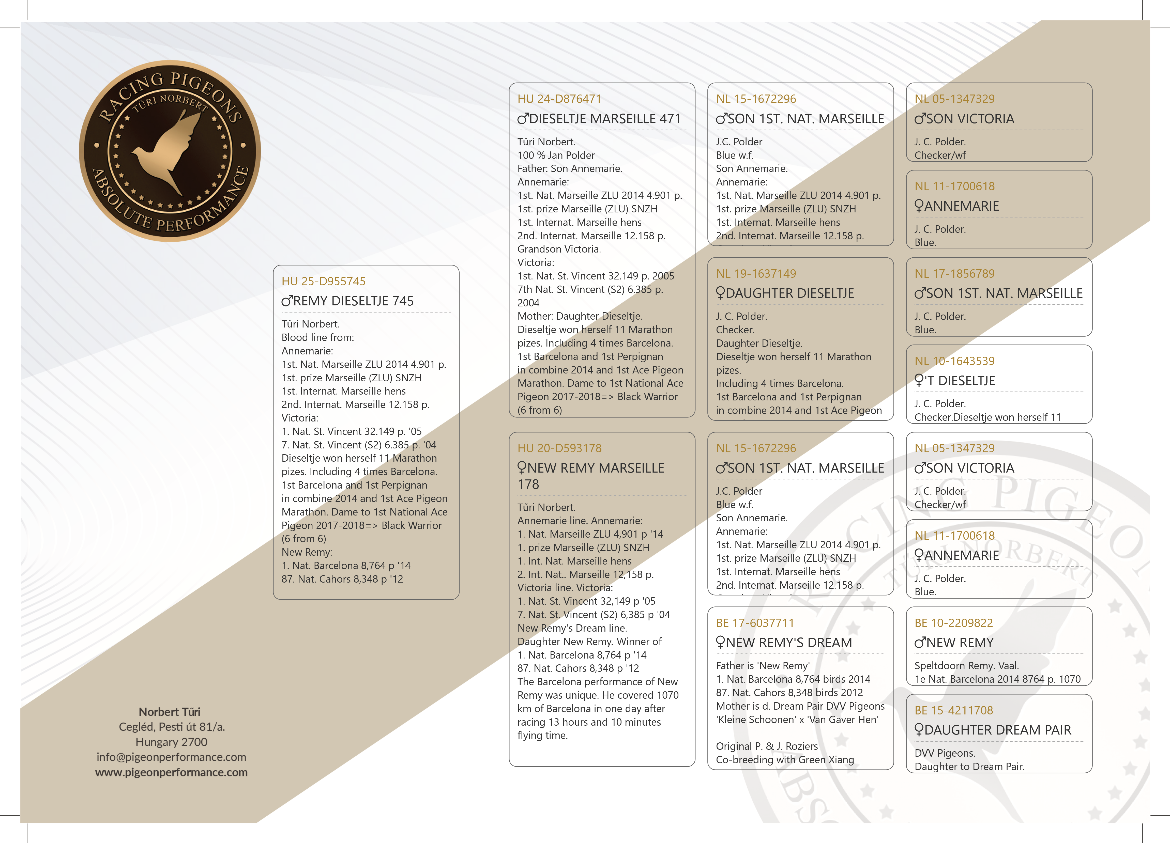 Tűri Norbert. Blood line from: Annemarie: 1st. Nat. Marseille ZLU 2014 4.901 p. 1st. prize Marseille (ZLU) SNZH 1st. Internat. Marseille hens 2nd. Internat. Marseille 12.158 p. Victoria: 1. Nat. St. Vincent 32.149 p. '05 7. Nat. St. Vincent (S2) 6.385 p. '04 Dieseltje won herself 11 Marathon pizes. Including 4 times Barcelona. 1st Barcelona and 1st Perpignan in combine 2014 and 1st Ace Pigeon Marathon. Dame to 1st National Ace Pigeon 2017-2018=> Black Warrior (6 from 6) New Remy: 1. Nat. Barcelona 8,764 p '14 87. Nat. Cahors 8,348 p '12