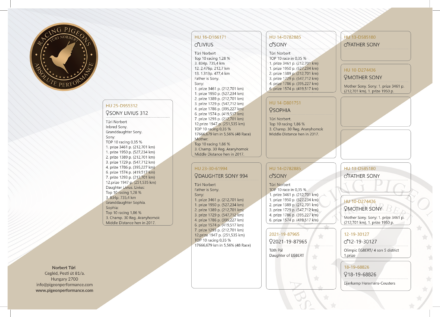 Tűri Norbert Top 10 racing 1,28 % 3. 834p. 735,4 km 12. 2.476p. 212,7 km 13. 1.313p. 477,4 km Father is Sony. Sony: 1. prize 3461 p. (212,701 km) 1. prize 1950 p. (527,234 km) 2. prize 1389 p. (212,701 km) 3. prize 1729 p. (547,712 km) 4. prize 1786 p. (395,227 km) 6. prize 1574 p. (419,517 km) 7. prize 1293 p. (212,701 km) 12.prize 1947 p. (251,535 km) TOP 10 racing 0,35 % 17666,679 km in 5,56% (48 Race) Mother: Top 10 racing 1,86 % 3. Champ. 30 Reg. Aranyhomok Middle Distance hen in 2017.