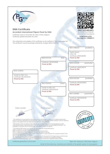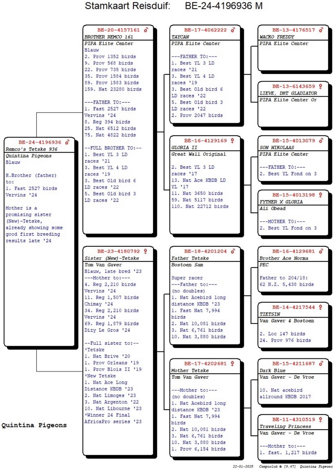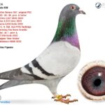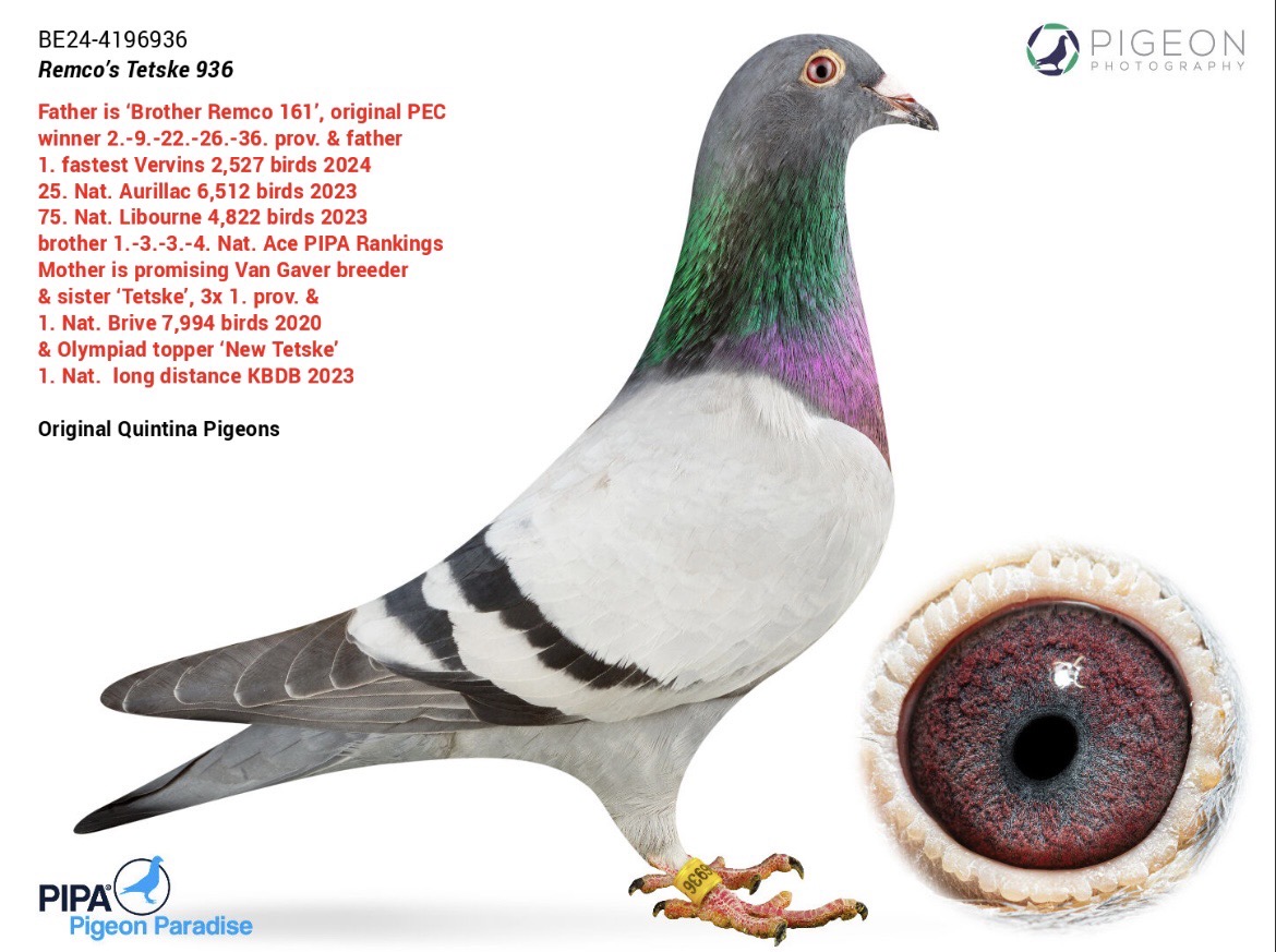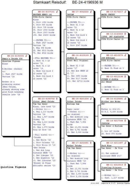 Quintina Pigeons Blauw Half brother (father) to: 1. Fast Vervins 2.527 p. '24 Mother is a promising sister (New)-Tetske, already showing some good first breeding results late '24. Tetske: Orig. Tom Van Gaver 1. Nat. Brive 4.238 p. '20 1. prov. Orleans 6.154 p. '19 1. prov. Blois II. 5.208 p. '19 =1. fastest 6.046 p.