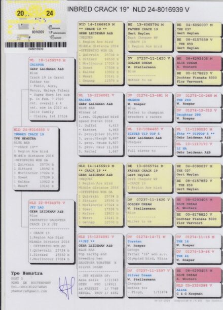 Ype Hemstra 100% Gebr. Leideman. Inbred Crack 19: Crack 19: 1. Regional Acebird Middle dist. 2016 4. prov. Soisson 6.403p. 5. prov Morlinc 5.934p. 4. Soissons 6.403p. 5. Morlincou 5.943p 6. Sens 4.237p. 11. Hapert 5.572p. 6. Lorris 1.769p. Raissa: 1.res.Olympiad p. speed Poznan '18 1. Duffel 4.613p. =fastest 6.969p. 2. prov. Quievrain 10.570p. 3. prov. Niergnies 9.897p. 3. prov. Heusden-Zolder 5.927p. 5. prov. Heusden-Zolder 11.336p. Jet: 1. Asse Zelik 11.343p. 1. NPO Gien 4.911p.=fastest 7.768p. 1. Rethel 4.692p. 6. Laon 6.371p. 10. Duffel 5.821p.